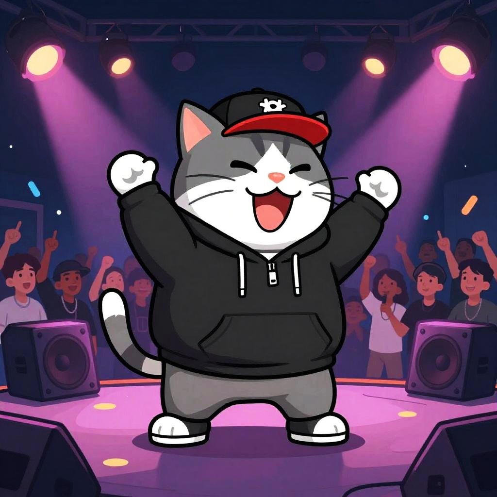 Fat cat rapper on stage with a booming crowd, wearing a hoodie and snapback, surrounded by neon lights and speakers, dynamic hip hop atmosphere, cartoon style