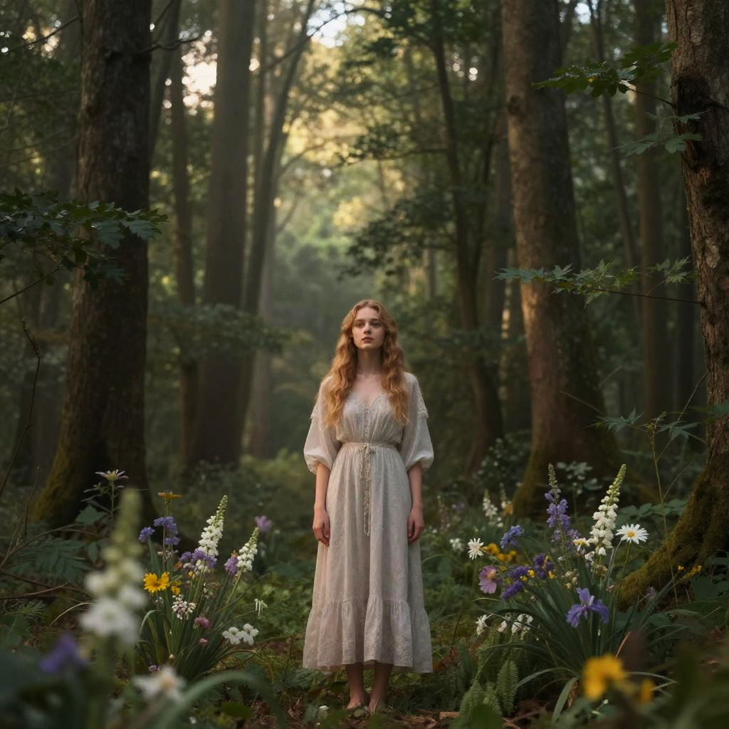 Jordana standing in a serene forest clearing at dawn, soft light filtering through tall trees, wearing a flowing dress, delicate flowers surrounding her, peaceful and ethereal atmosphere, highly detailed, nature-inspired fantasy scene.