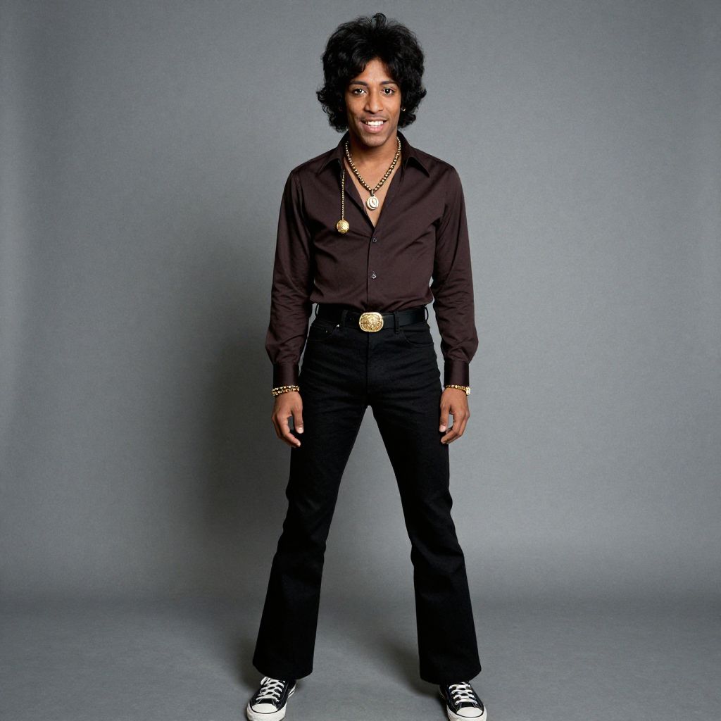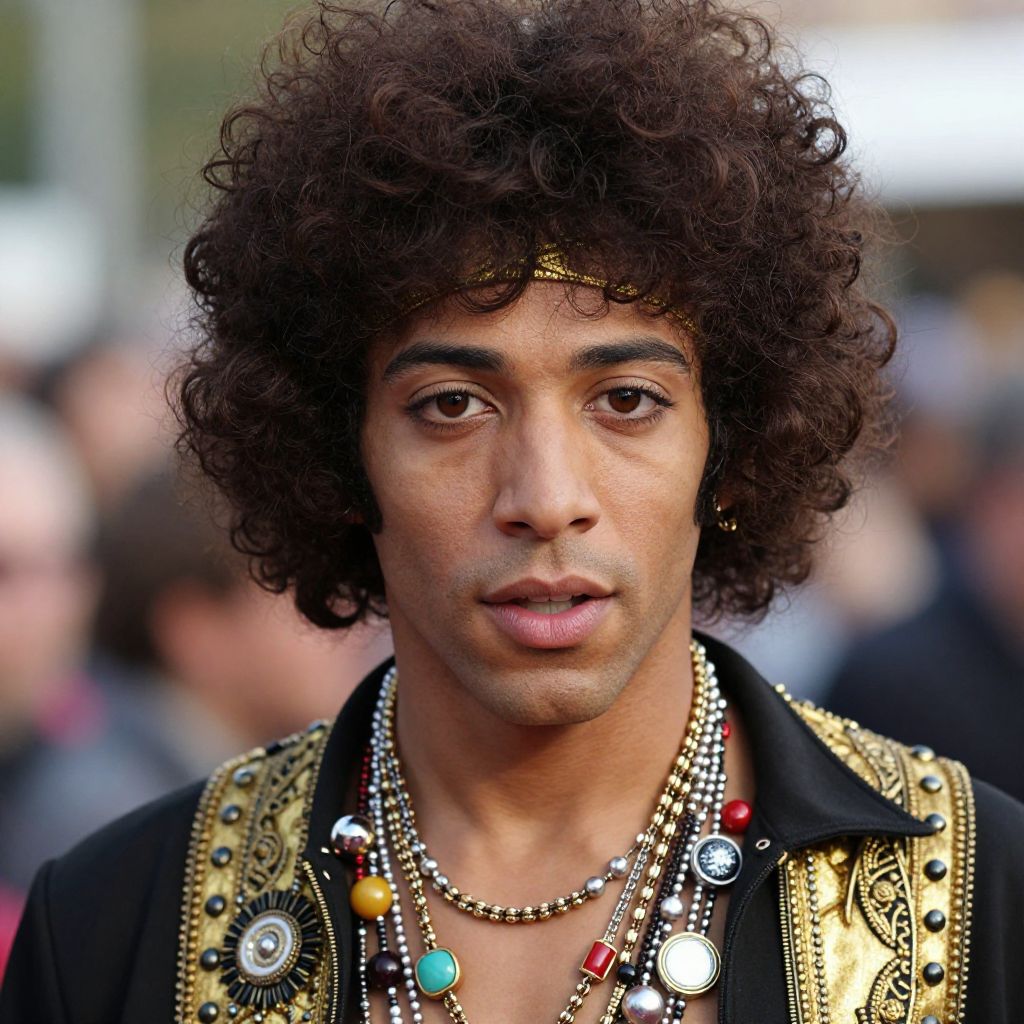 "jimi hendrix costume, solo, afro, 1boy, male focus, jewelry, necklace, headband, looking at viewer, realistic, lips, blurry, brown eyes, blurry background, upper body, curly hair, brown hair Realistic photo of casual sexy person with pretty face"