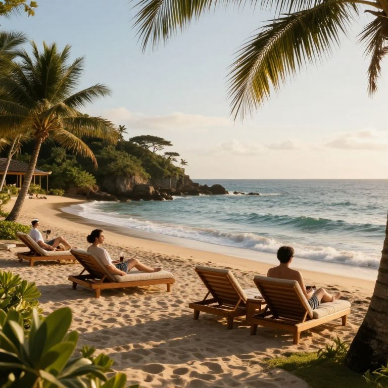 Photograph of a tropical beach at sunset. Three people, two with dark hair and one with light hair, lounge on wooden deck chairs on the sandy shore, facing the ocean. The beach is bordered by lush green palm trees and foliage. The clear blue sea has gentle waves, with a rocky outcrop on the left. The sky is a gradient of light blue to orange, indicating the sun is setting. The scene is peaceful and idyllic, with sunlight casting soft shadows on the sand.