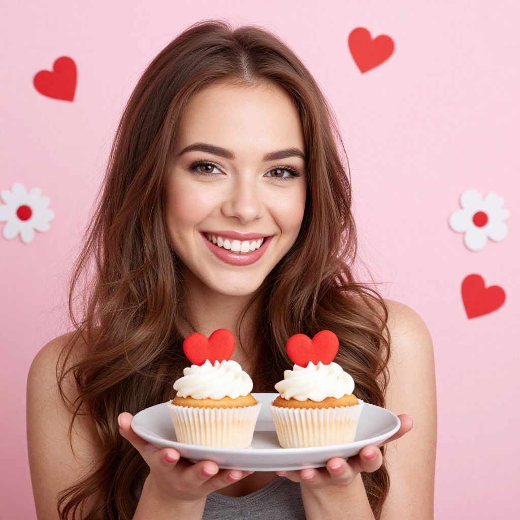 Young woman with long brown hair smiling brightly while holding a white plate with two cupcakes topped with red hearts, set against a pink background adorned with scattered hearts and flowers.