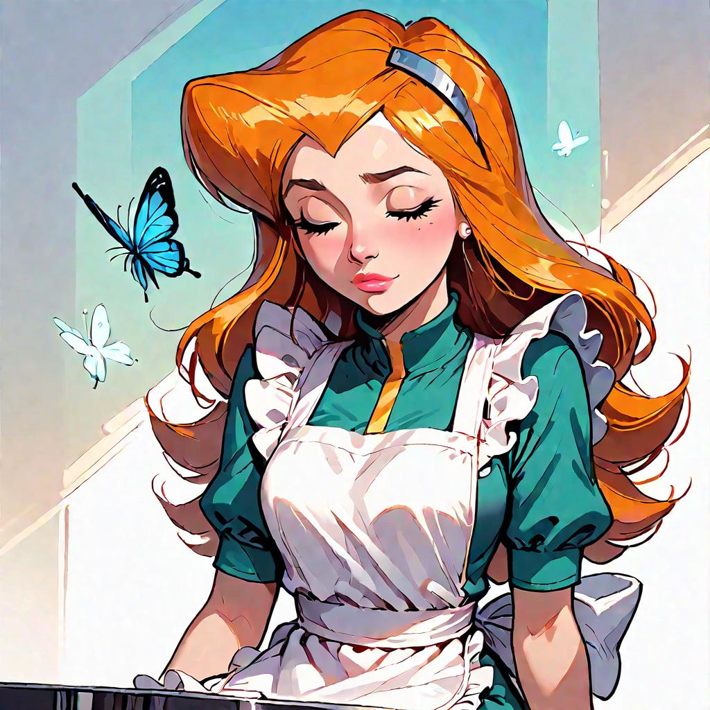 Score_9, score_8_up, score_7_up, source_anime, 1girl, sam \(totally spies\), long hair, ((short sexy apron)), sleepy, butterfly sitting, portrait