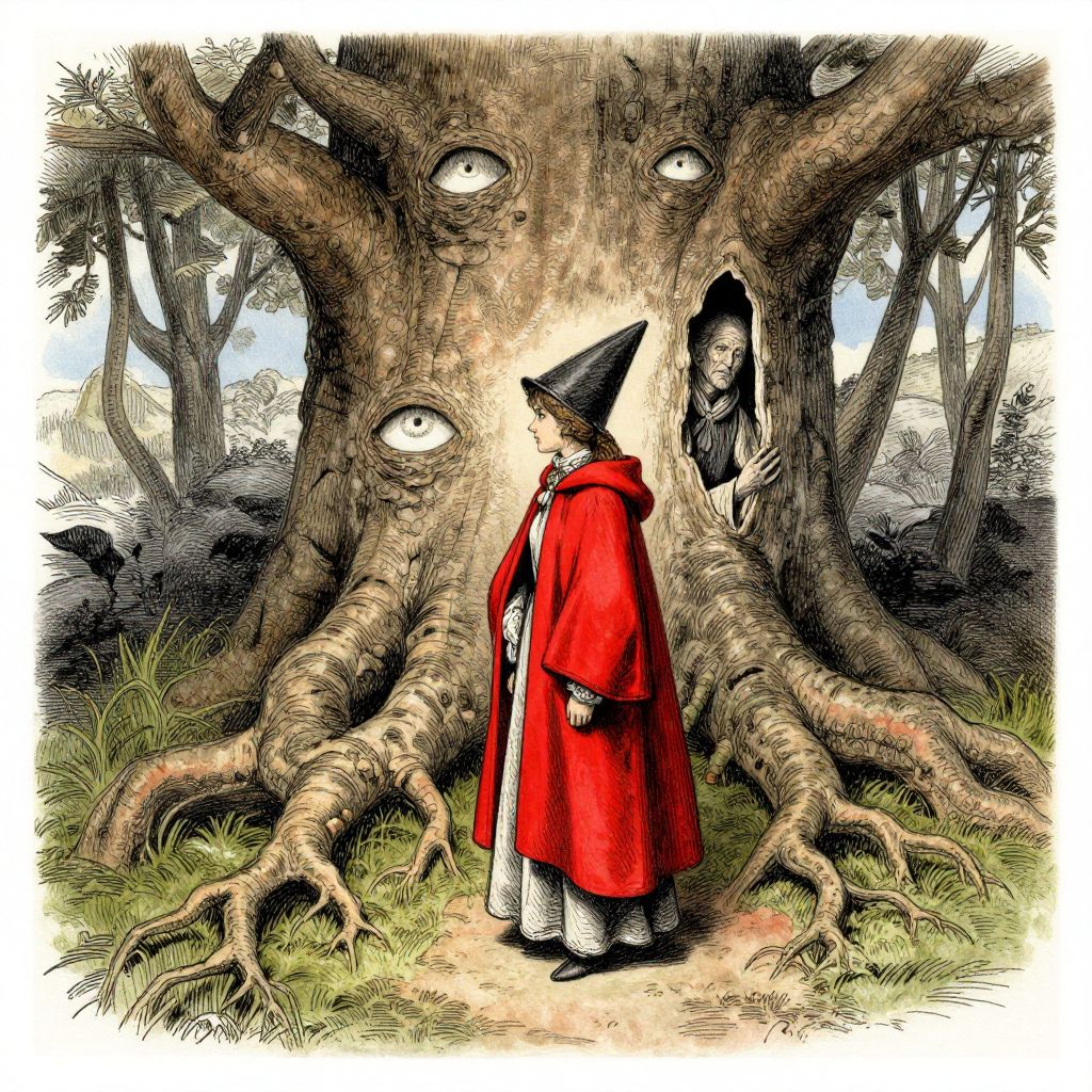Illustration of Little Red Riding Hood standing before a large, gnarled tree with an eye and a wolf's face in the hollow. Red cloak
