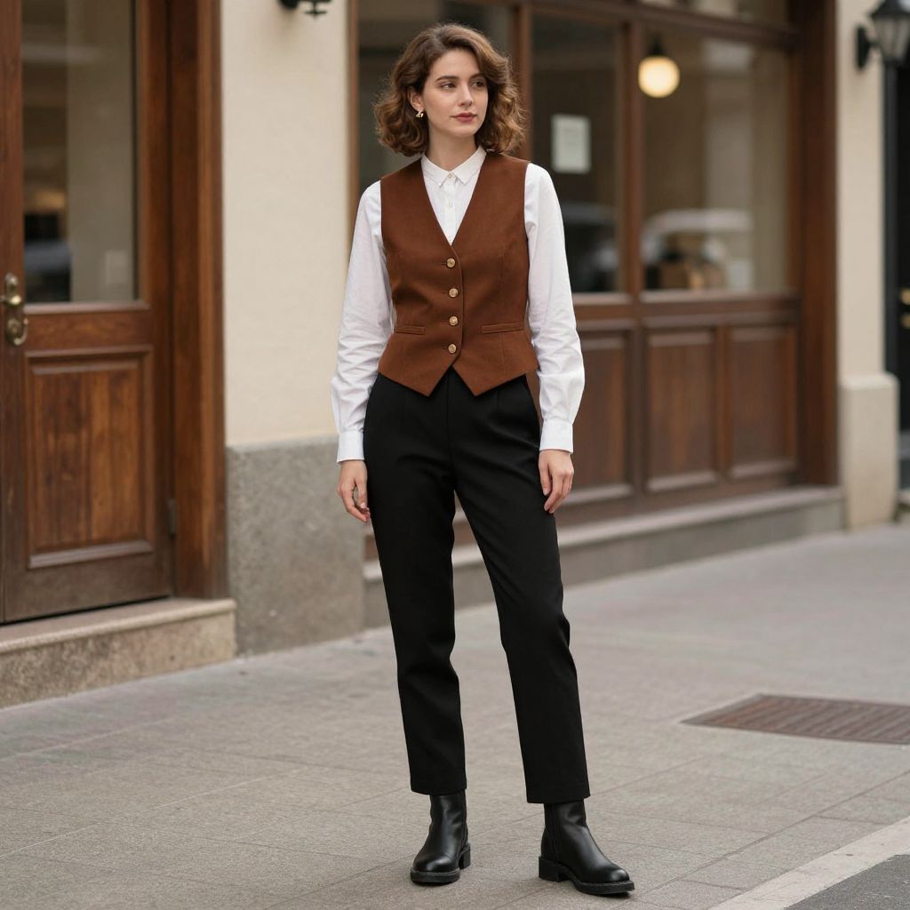 Retro Outfit Woman Costume, woman in a brown vest and black pants standing on a sidewalk