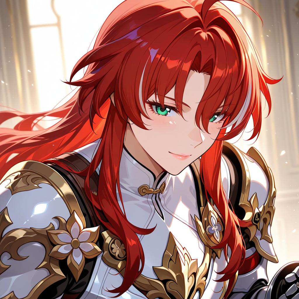 Argenti (honkai: star rail), honkai: star rail, 1boy, green eyes, hair between eyes, red hair, long hair, curtained hair, streaked hair, ahoge, parted bangs, white armor, knight, gauntlets, knight, pauldrons, breastplate, by artist piromizu, illustrious