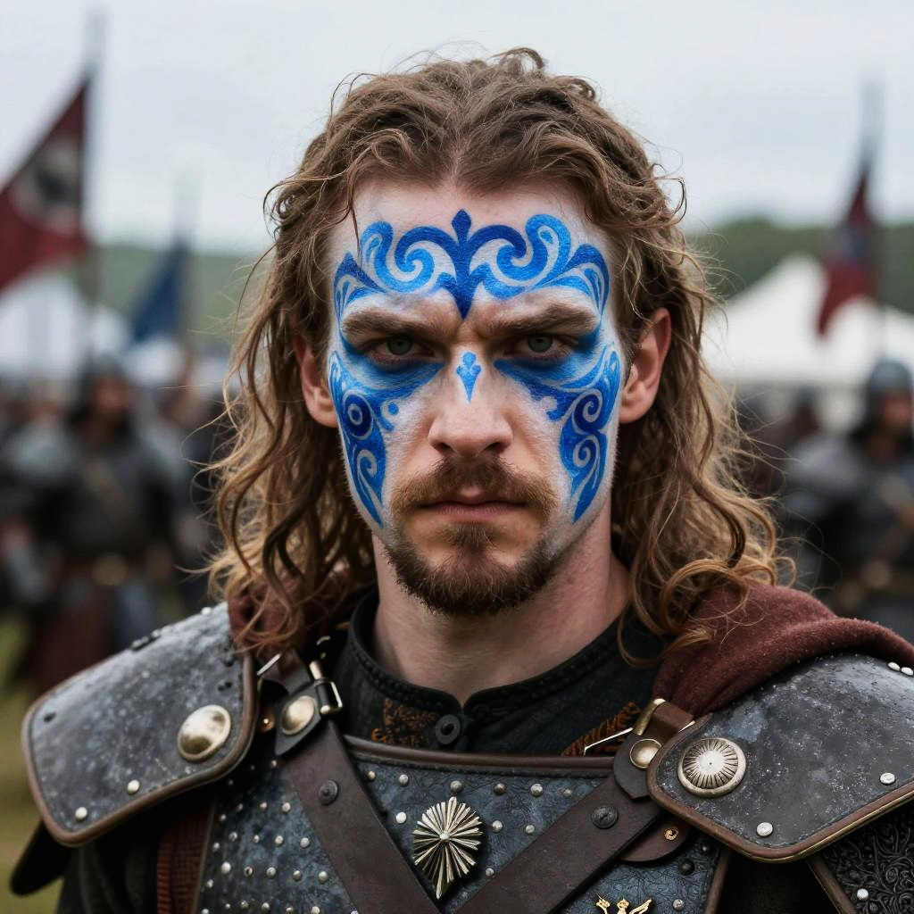 Braveheart war paint on a fierce Scottish warrior's face, intricate blue patterns, intense gaze, medieval battlefield background, vivid colors, cinematic lighting