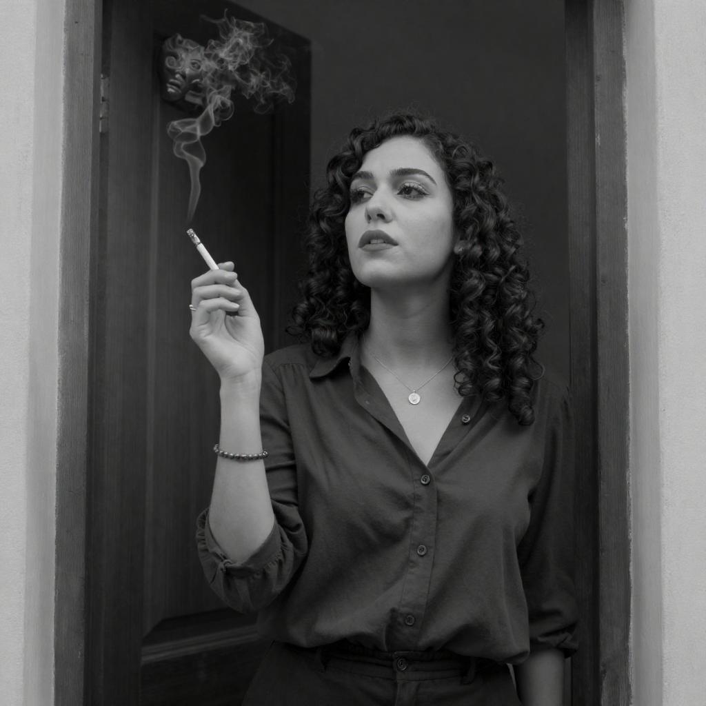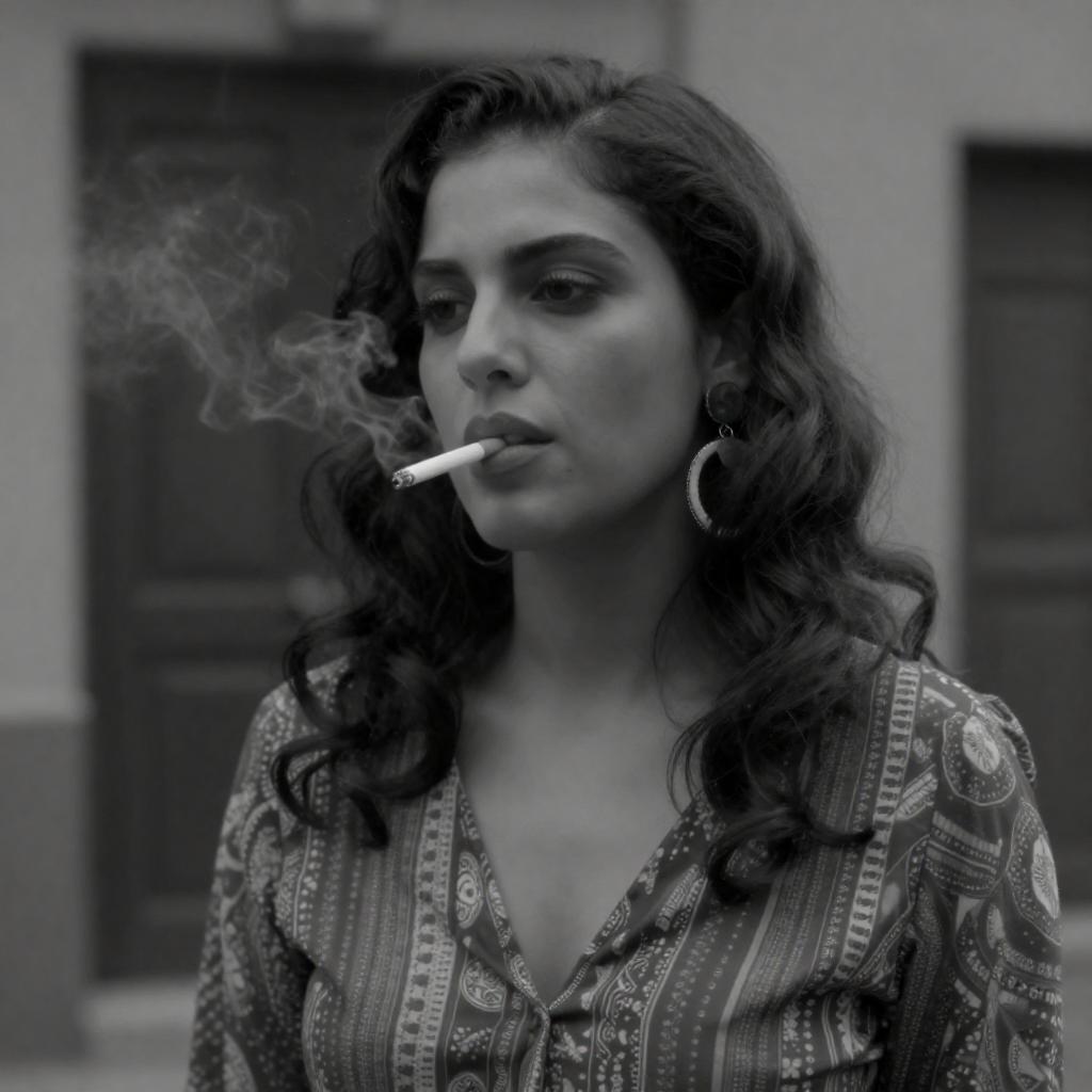Black and white photograph of a woman with wavy dark hair, wearing a patterned dress and large earrings. She has a cigarette in her mouth, looking slightly to the side with a neutral expression. Background includes a blurred door and wall. Smoky ure overlays the image. Woman in center, with patterned dress on right.
