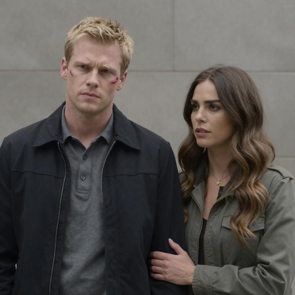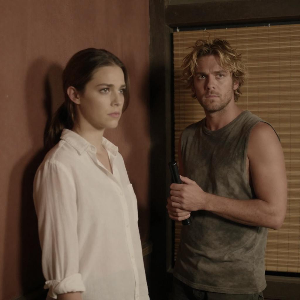 Photograph of two people, a woman and a man, standing next to a palm tree in a tropical forest. The woman with long brown hair, wearing an orange shirt, looks to the left. The man with blond hair, wearing a plaid shirt, leans against the tree with a concerned expression. Palm trees in the background. The woman's hand rests on the tree, while the man's hand grips it. Both have light skin. The man's shirt is slightly open. Bright, natural light.