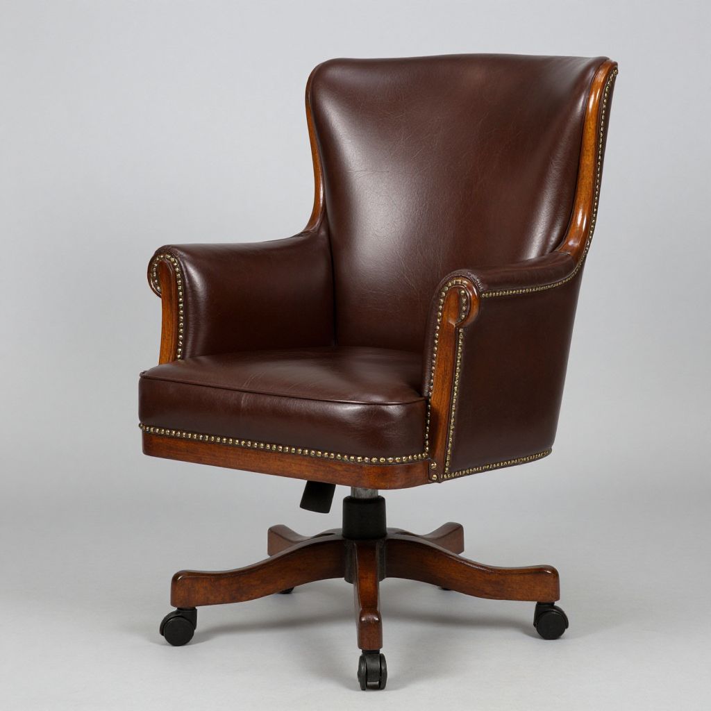 Elegant antique leather swivel captain's desk chair featuring polished mahogany wood accents, gold nailhead trim, and a five-star base with casters, showcasing classic craftsmanship and timeless design.