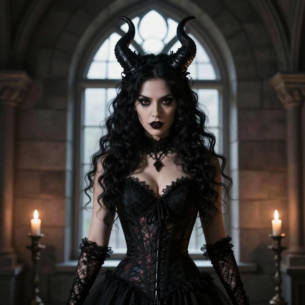 Photograph of a gothic-style woman standing in a dimly lit, stone-walled room with arched windows. She has long, curly black hair, wears black lace gloves and a corset with intricate patterns, and has black, horned headpieces. Her dark lipstick matches her dramatic, intense expression. Two lit candles are positioned on either side of her in the background.