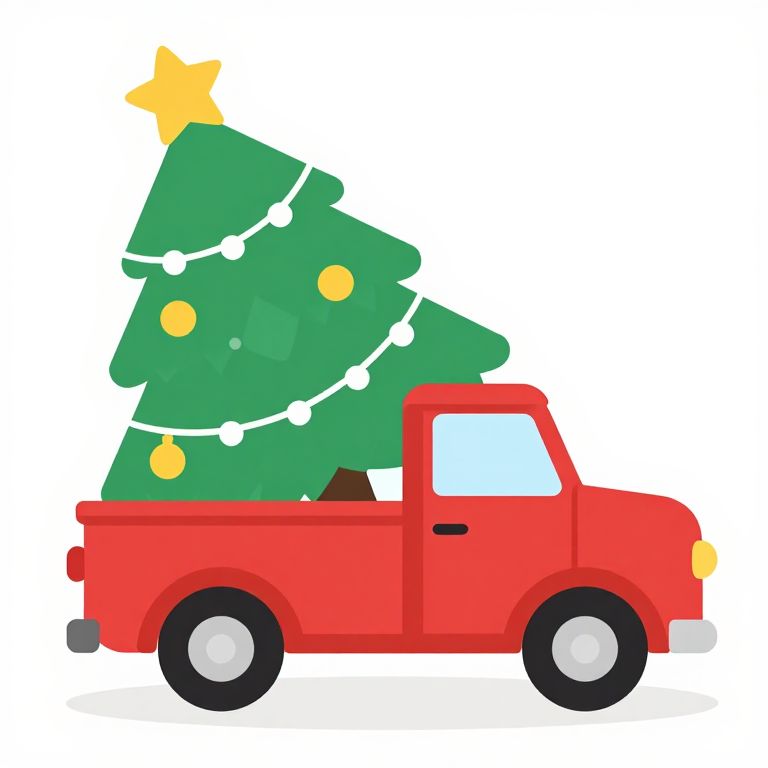 A vibrant vector art illustration featuring a retro red truck carrying a festive green Christmas tree adorned with gold ornaments, white lights, and a yellow star, capturing the charm of holiday cheer in a cute, cartoon-style design.