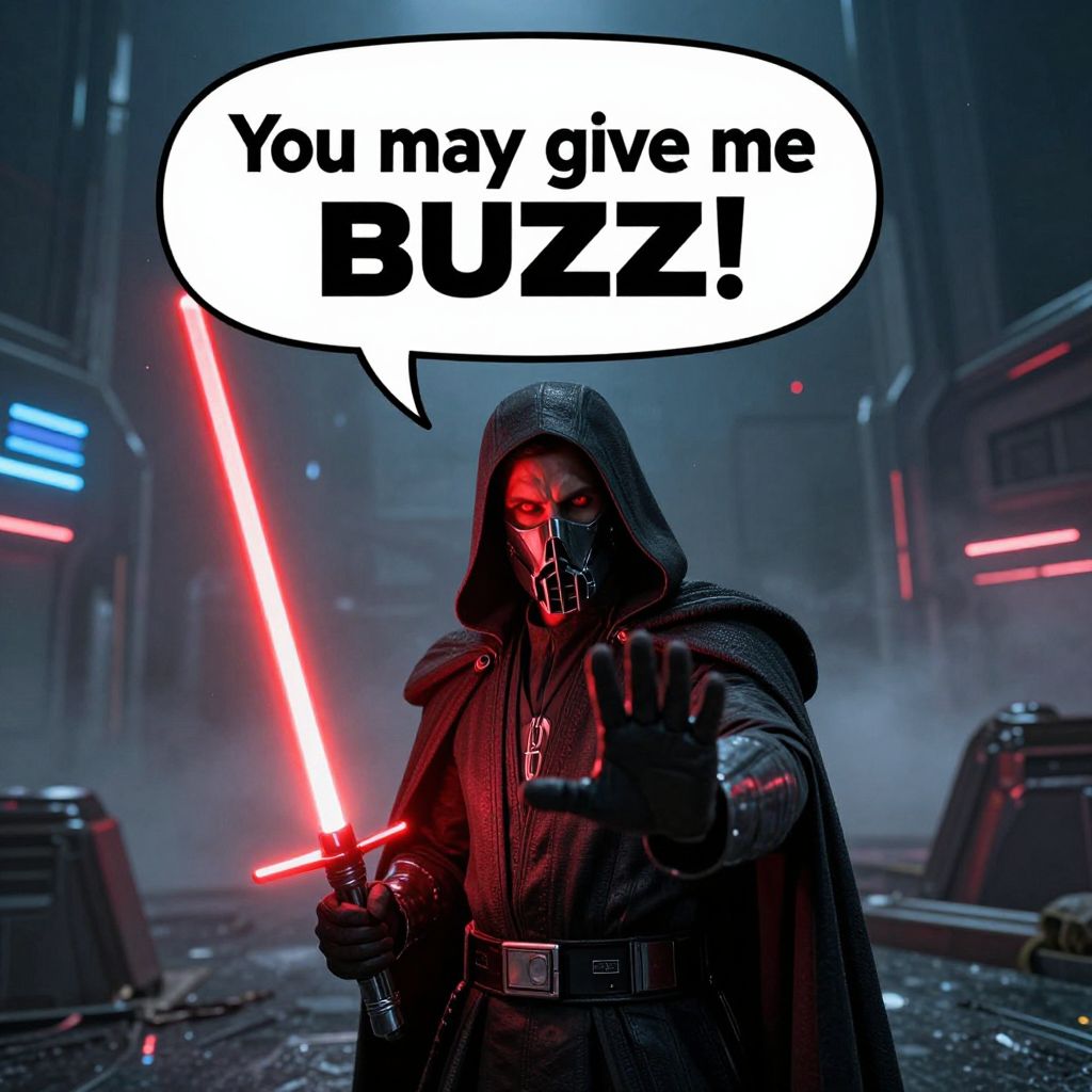 A sith with red light saber says in a large speech bubble ‘You may give me BUZZ!’, The font fits the star wars franchise, The man has red eyes, a dark appearance, and wears a dark worn out sith outfit with and a cloak, He has a dark face, red glowing eyes and a black metal mouth mask, His expression show determination as he has the red light saber in his right hand, His left hand is closer to the viewer, He reaches out with his left hand towards the viewer as if he wanted to force choke the viewer, The scene is set on Coruscant, with the foggy cyberpunk background with neo lights at night, The background hints at a life of hardship and rough adventures, now reduced to begging in a gritty and harsh world
