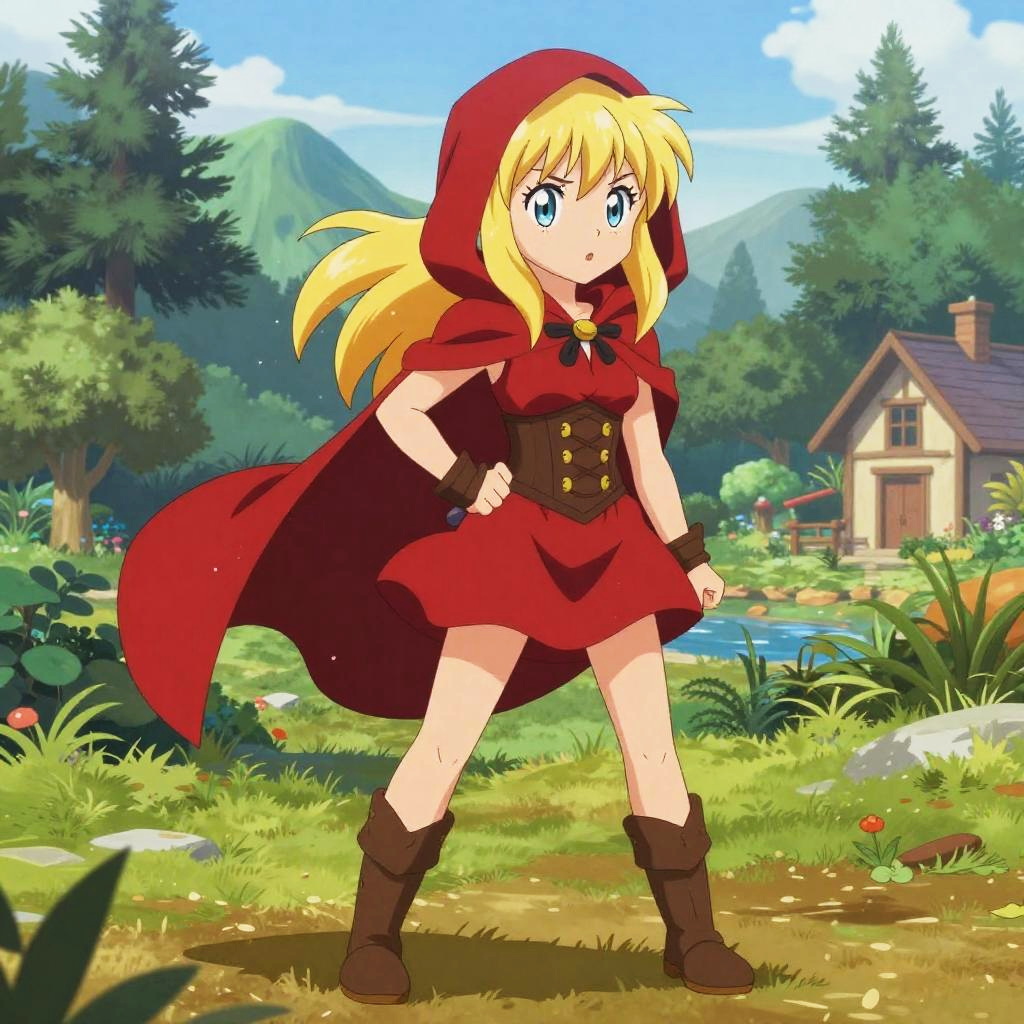 Anime-style drawing of a young girl with blue eyes, brown hair, wearing a red hooded cloak, red dress, brown boots, and a belt