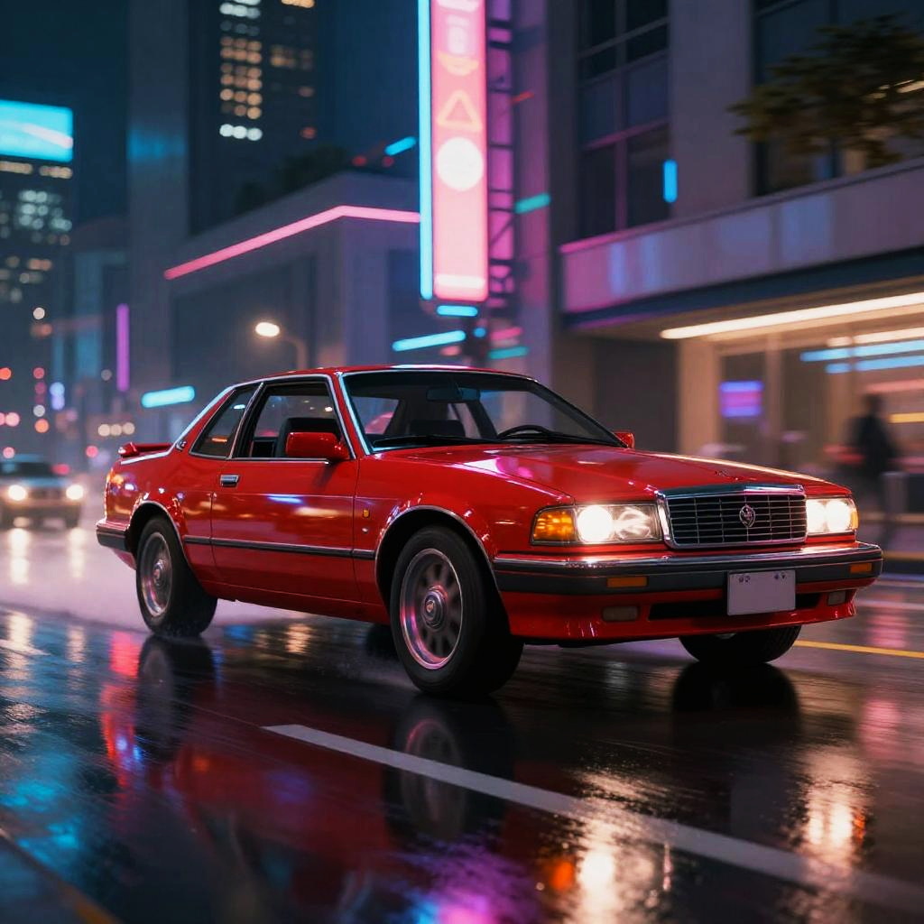 Red 80s car speeding down a neon-lit city street at night, reflections on wet asphalt, vibrant futuristic cyberpunk atmosphere, detailed chrome and sharp angles