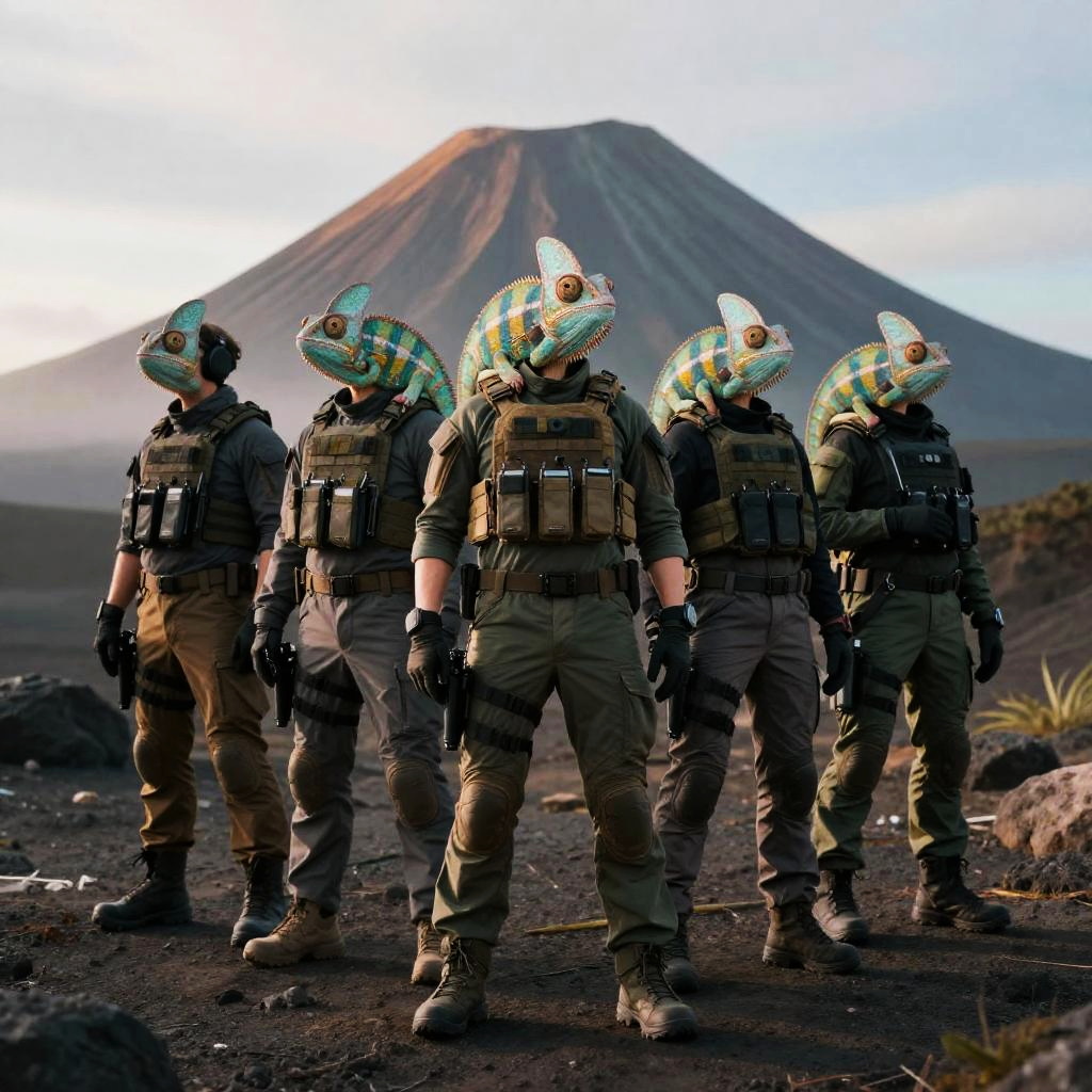 Realistic photo.Fully body portrait of a five men and one woman with chameleon heads instead of human heads, photograph, anamorphical lens, wearing modern tactical gear with volcano background, Tilt Blur, 32k, Super-Resolution, Megapixel, Pro Photo RGB, VR, Good, Massive, Half rear Lighting, Backlight, soft Lighting, Incandescent, Optical Fiber, Moody Lighting, Cinematic Lighting, Studio Lighting, Soft Lighting, Volumetric, Conte-Jour, Beautiful Lighting, Accent Lighting, Global Illumination, Screen Space Global Illumination, Ray Tracing Global Illumination, Optics, Glowing, Shadows, Shimmering, Ray Tracing Reflections, Lumen Reflections, Screen Space Reflections, Diffraction Grading, Chromatic Aberration, GB Displacement, Ray Traced, Post-Production, Cell Shading, Tone Mapping, CGI, VFX, insanely detailed and intricate, hyper maximalist, hyperrealism, hyper-realistic portrait, exquisite detail, elegant, super detailed, dynamic pose, photography, volumetric, ultra-detailed, intricate details, 4K, super detailed. realistic photo