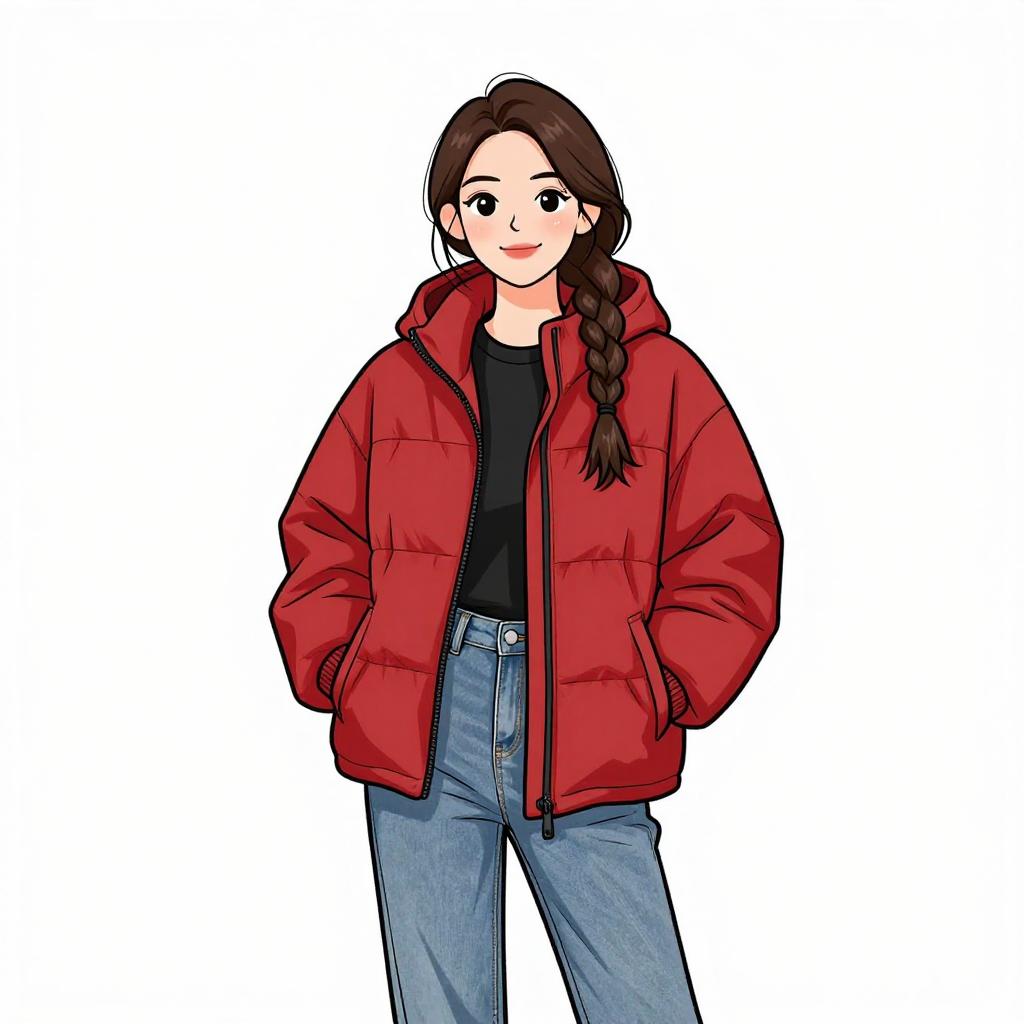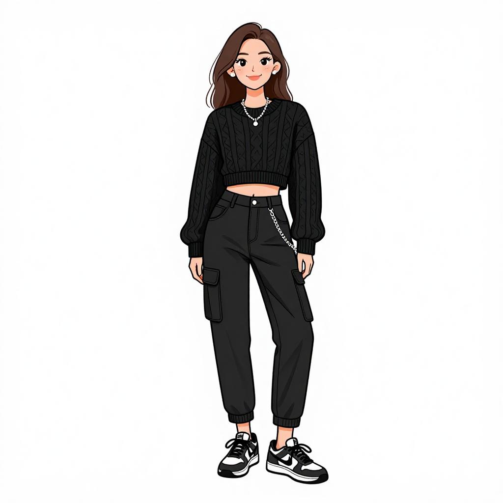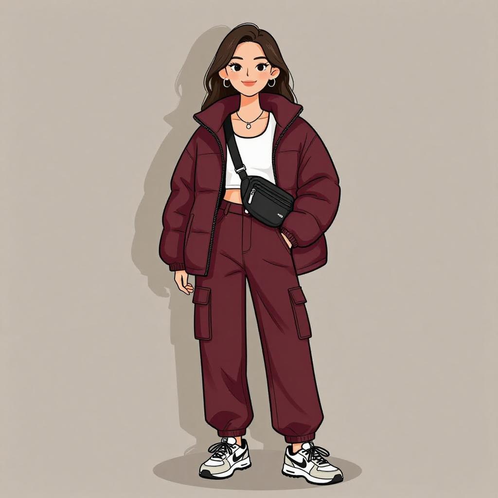 Woman with pretty face and pretty hair. smiling Woman, streetwear, black oversized puffer jacket, mock-neck pink sweater with a ribbed texture, fitted black cycling shorts, white lace-up sneakers, black ankle socks, minimal makeup, simple stud earrings, white studio background. --sref 1467