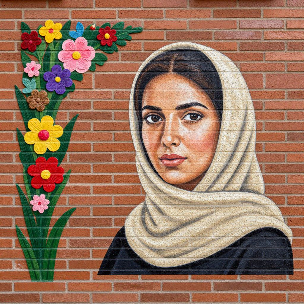 Mural of South Asian woman in white headscarf, black top, with colorful flower bouquet on red brick wall, realistic style.