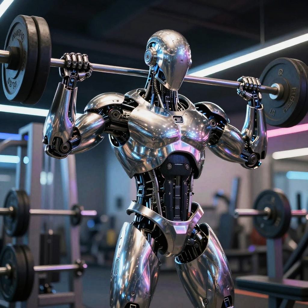 AI body builder, futuristic humanoid robot with exaggerated muscular anatomy, gleaming metallic skin, performing intense weight lifting in a high-tech gym environment, neon lights reflecting off chrome surfaces, cybernetic enhancements visible, hyper-realistic style