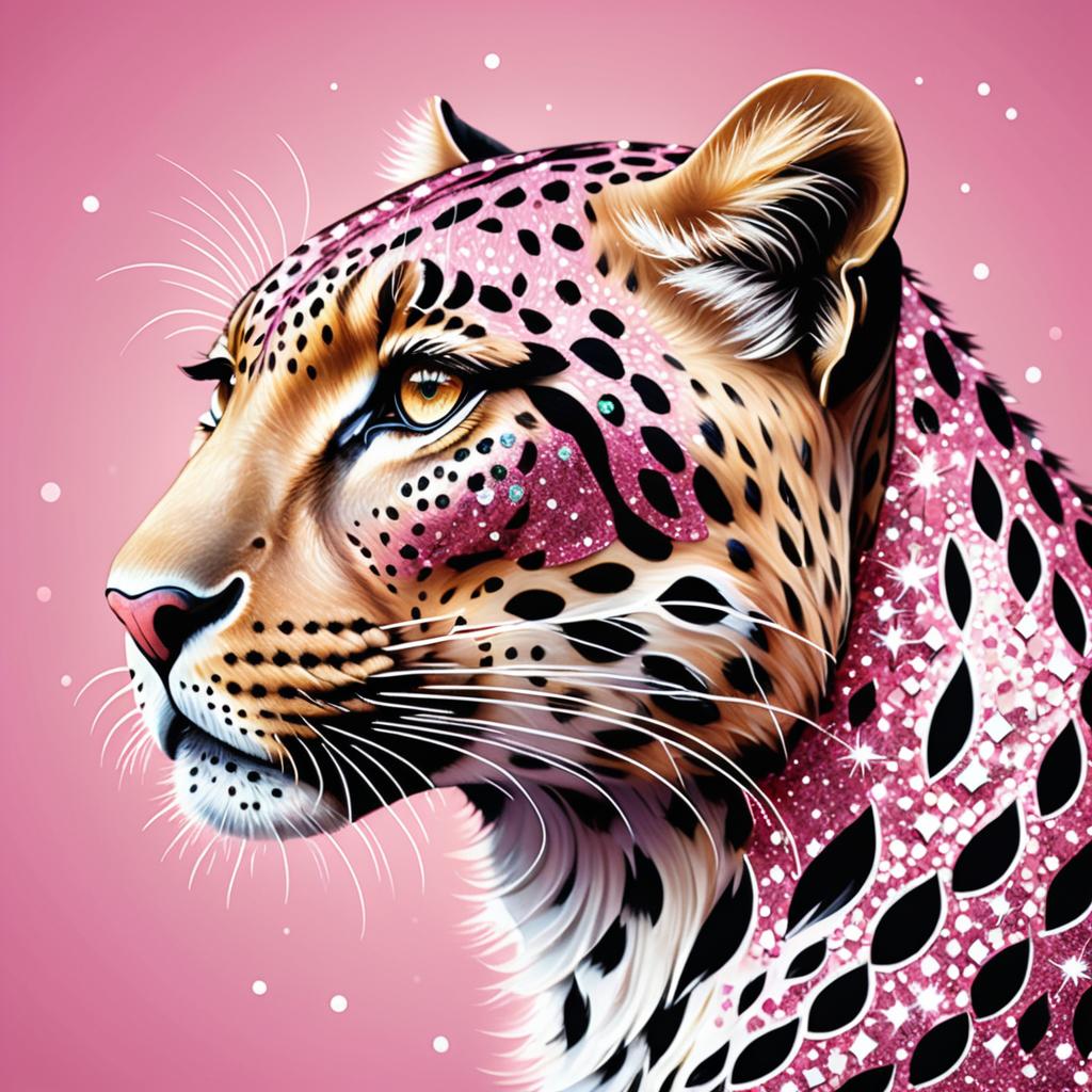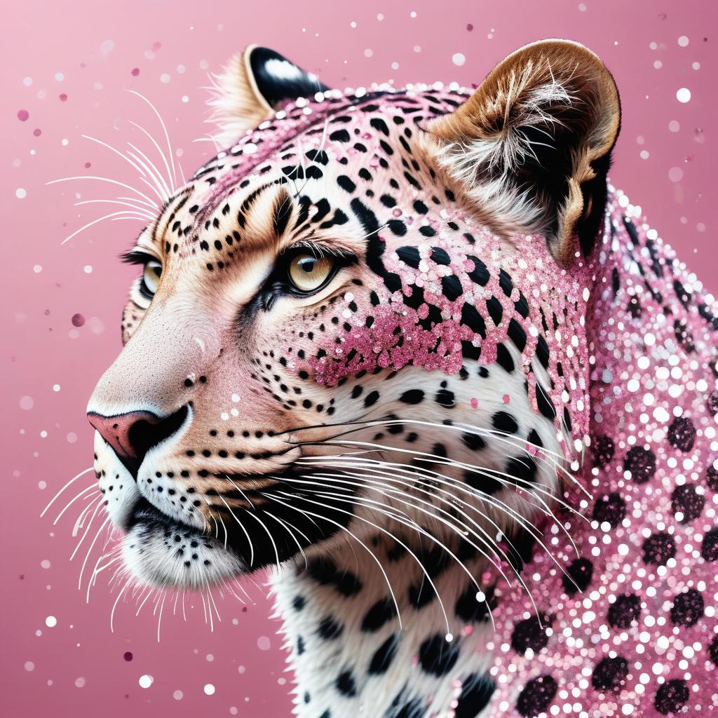 A majestic leopard covered in sparkling glitter art, shining and decorated with a sparkling texture and decorative pattern, set against a solid pink color background, pink and white color scheme, close-up profile view, highly detailed, vibrant and eye-catching