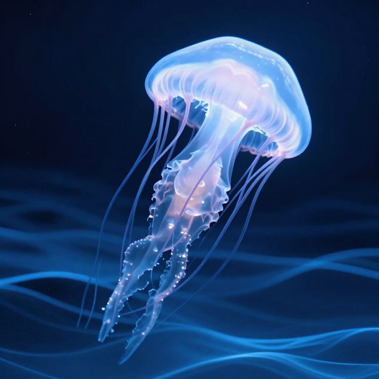 Photograph of a glowing blue jellyfish with translucent, flowing tentacles against a dark blue underwater background.