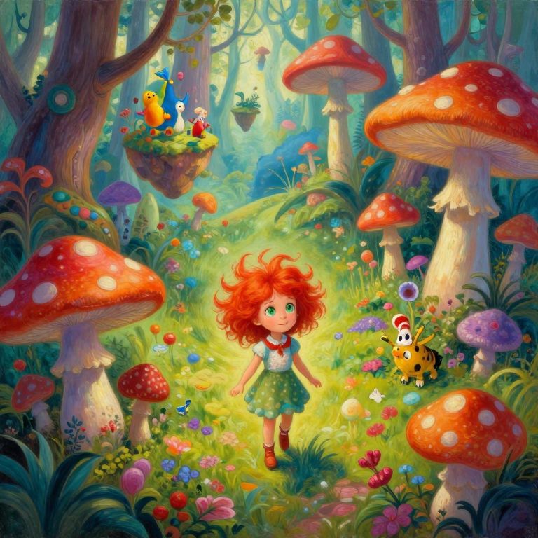 Imagine an enchanting oil painting inspired by Dr. Seuss's whimsical world, depicting a young girl with fiery red hair and wide green eyes as she explores a fantastical forest from an aerial viewpoint. This vibrant scene features towering mushrooms in vivid colors and intricate patterns reminiscent of dreamlike landscapes, while floating islands adorned with playful creatures evoke the psychedelic art style. Soft, ethereal light bathes the flora and fauna in a mesmerizing glow, evoking both joy and wonder as it illuminates this surreal world filled with hidden delights around every bend.