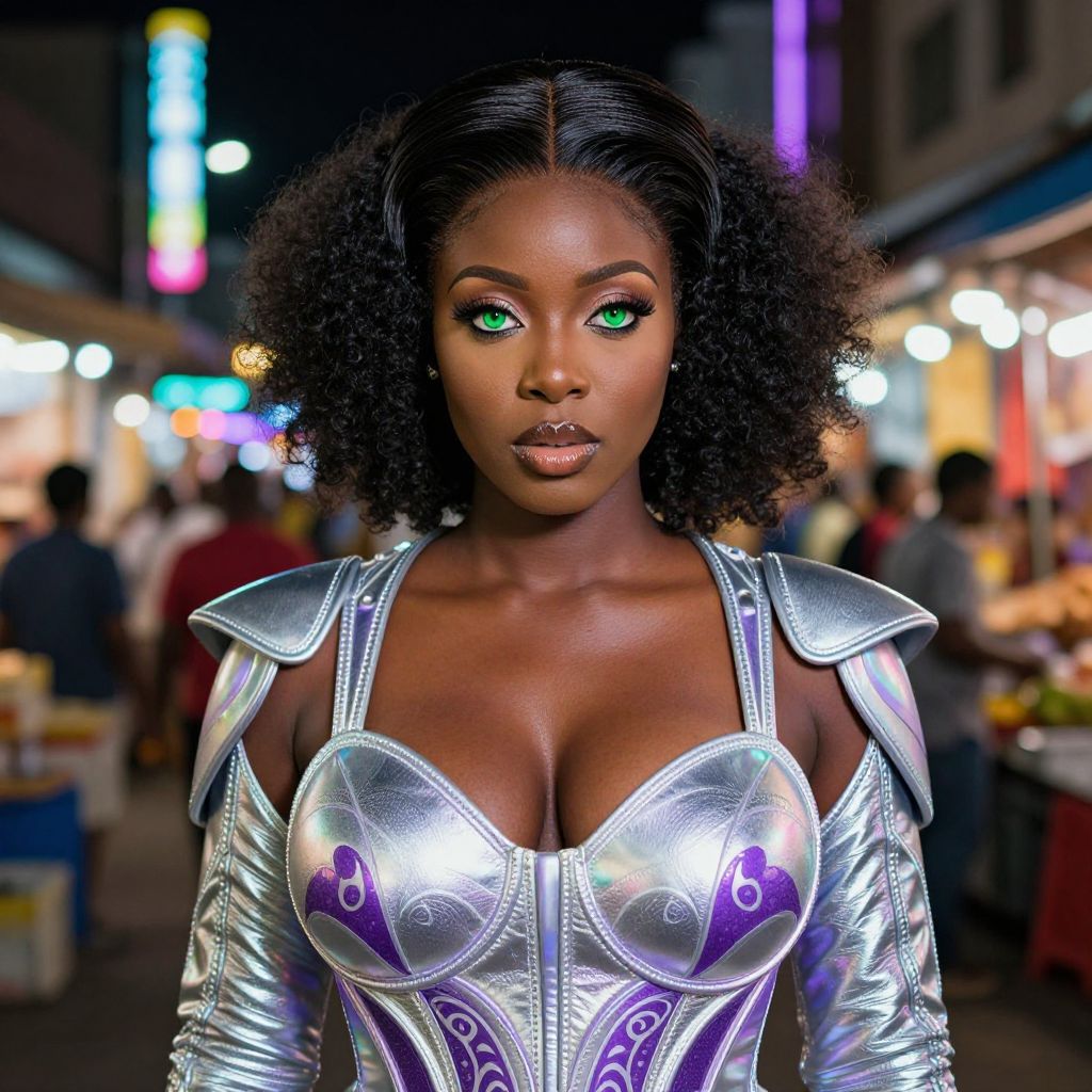 Photorealistic digital artwork of a dark-skinned woman with striking green eyes, wearing a futuristic, metallic silver and purple bodysuit with prominent shoulder armor and a low-cut, corset-style top highlighting her large breasts. She has curly black hair and a serious expression. The background is a bustling nighttime market with blurred neon lights and people, creating a vibrant, urban atmosphere. The metallic textures of her outfit reflect light, adding a sci-fi aesthetic to the image.