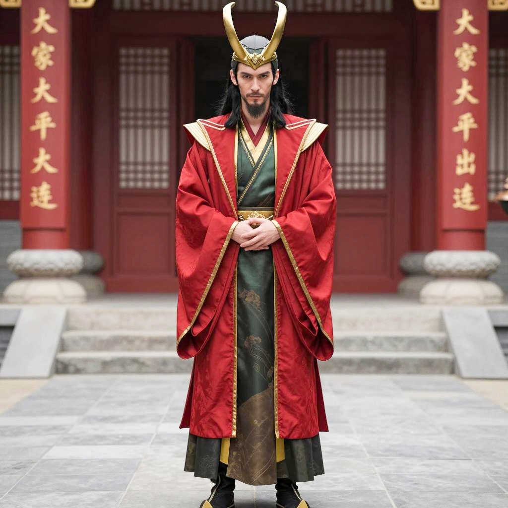 Loki costume dress, photorealistic, full-body portrait, male character, standing, traditional Chinese fantasy attire, long red robe with gold trim, layered garments, black horned helmet, long black beard, holding hands together, serious expression, Chinese palace background, vertical red banners with gold characters, stone steps, tiled floor, realistic ures, detailed clothing, medieval fantasy style, CGI art, realistic lighting, frontal view, fantasy character design, traditional Chinese architecture, detailed ures on clothing and background, realistic facial expression.