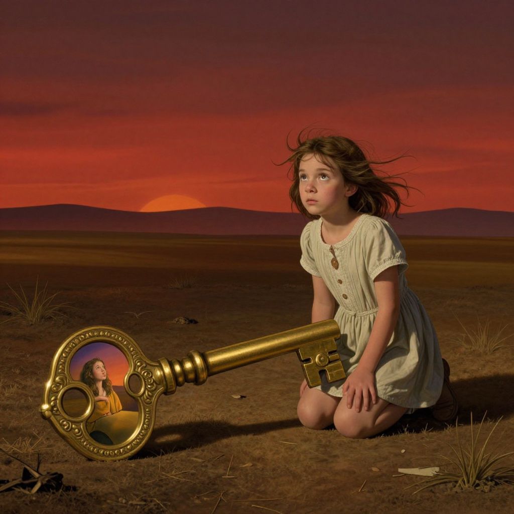 In this digitally rendered, surreal photograph, a young girl with light skin and brown, wind-swept hair kneels in a barren, desert-like landscape at sunset. She wears a cream-colored, short-sleeved, button-up dress. A large, gold key with an ornate handle rests on the ground in front of her, its head featuring a circular inset showing her own portrait. The sky behind her is a gradient of deep red and orange, with a setting sun casting a warm glow. The distant horizon shows dark, silhouetted mountains. Sparse, dry grasses dot the sandy ground. The image evokes a sense of longing and mystery.