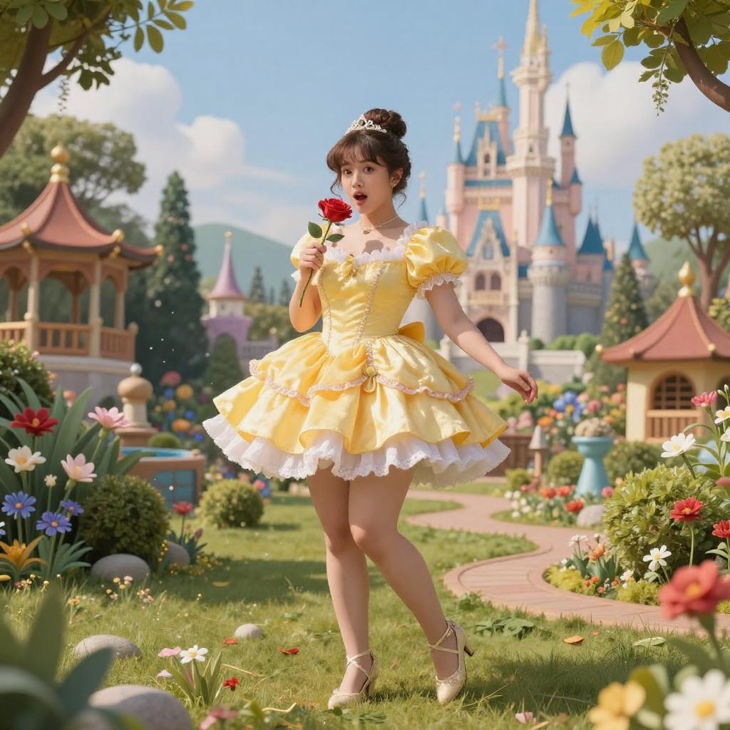 A young woman in a detailed yellow princess-style dress with puffed sleeves and lace trim stands in a vibrant garden holding a red rose. She has her hair styled in a bun adorned with a tiara and wears matching yellow heels. The background features a fantasy castle with blue and gold spires, colorful flowers, trees, and decorative gazebos. The scene is bright and colorful with natural daylight illuminating the setting.