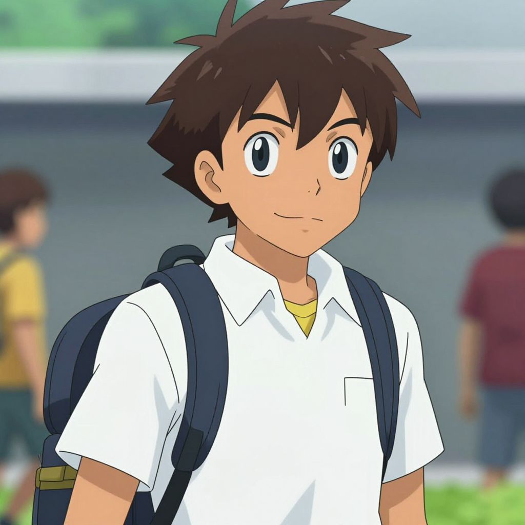 Digital anime-style drawing of a young boy with dark spiky hair, wearing a white shirt, yellow tee, and black backpack, smiling in a blurred