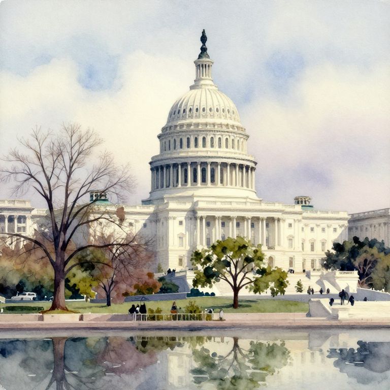 The image depicts a watercolor painting of the United States Capitol Building in Washington, D.C., rendered in a soft, impressionistic style. The Capitol's iconic dome, adorned with intricate architectural details, stands prominently in the center, bathed in a muted palette of blues and grays. Surrounding the building, a variety of trees, both bare and leafy, create a dynamic foreground, their branches reaching out in different directions. The sky above is a blend of soft, pastel hues, adding to the serene and somewhat melancholic atmosphere of the scene. The reflection of the Capitol and trees can be seen in the water below, creating a symmetrical and balanced composition. The overall effect is a harmonious blend of natural and man-made elements, captured in a dreamlike, artistic rendering.