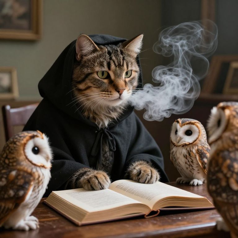 Photograph of a tabby cat with green eyes, wearing a black hooded cloak, sitting at a wooden table. The cat is smoking a cigarette, with white smoke curling upwards. Three brown and white owls are perched around the table, looking at the cat. An open book lies on the table in front of the cat. The background is a blurred, dimly lit room with framed pictures on the wall. The image has a whimsical, surreal quality.