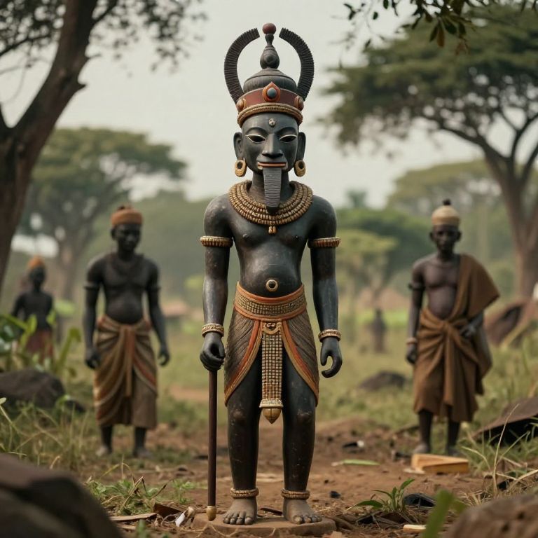 A photograph of a dark bronze statue of a deity with an elongated face, prominent nose, and a headdress with a circular top. The statue stands in the center, wearing a beaded necklace, armbands, and a loincloth adorned with beads. Its hands hold a staff. In the background, three similarly dressed, dark-skinned statues stand amidst a forested area with trees and greenery. The statues have a traditional African appearance, with the central figure being the most detailed. The ground is dirt with scattered rocks and grass. The overall scene is natural and slightly misty.