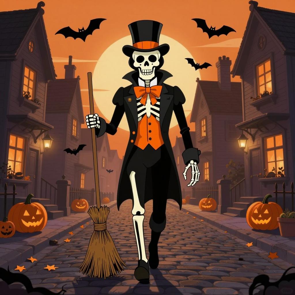 Illustration of a skeleton character wearing a black and orange Victorian-style outfit with a top hat, walking down a cobblestone street at dusk. The setting features old eerie houses with glowing windows, lit jack-o'-lanterns on doorsteps, and bats flying in an orange sky, emphasizing a Halloween atmosphere. The skeleton holds a straw broom, enhancing the spooky theme.