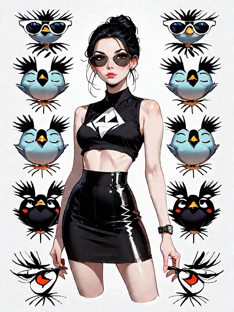 Digital illustration of a stylish woman with pink hair tied in a bun, wearing a sleeveless turquoise top with a plunging V-neckline and a shiny pink mini skirt. She is crouching and wearing black high-heeled shoes. Three colorful cartoon birds—blue, yellow-pink, and pink—are flying around her. The background is white.