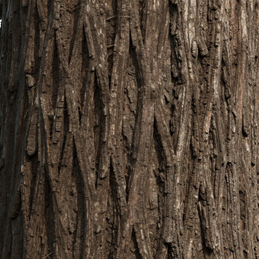 Seamless tree texture with deep grooves and fibrous appearance, aged bark with subtle color gradients from dark browns to grays, ideal for photorealistic environment creation, seamless tileable for 3D assets