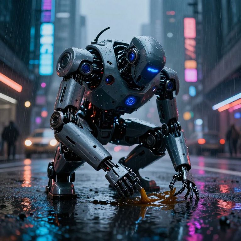 Cybernetic robot crouching in rainy, neon-lit city street, splashing puddles. Bright blue eyes, metallic body, futuristic