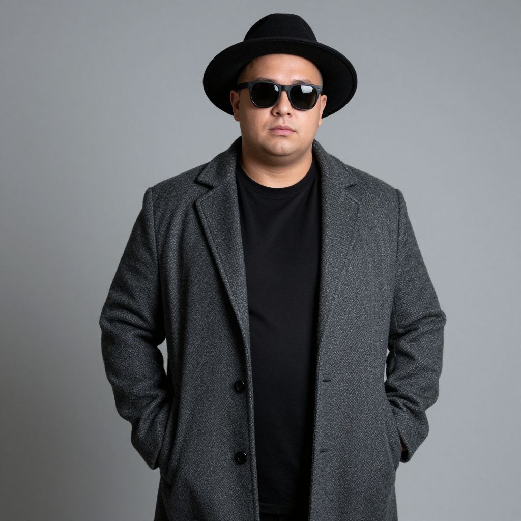 Plus size nacho libre, 1boy, male focus, solo, sunglasses, hat, hands in pockets, simple background, coat, grey background, looking at viewer