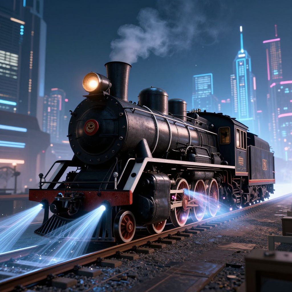 Photorealistic CGI of a black steam locomotive with glowing blue exhaust and headlights, set against a futuristic city skyline with neon lights.