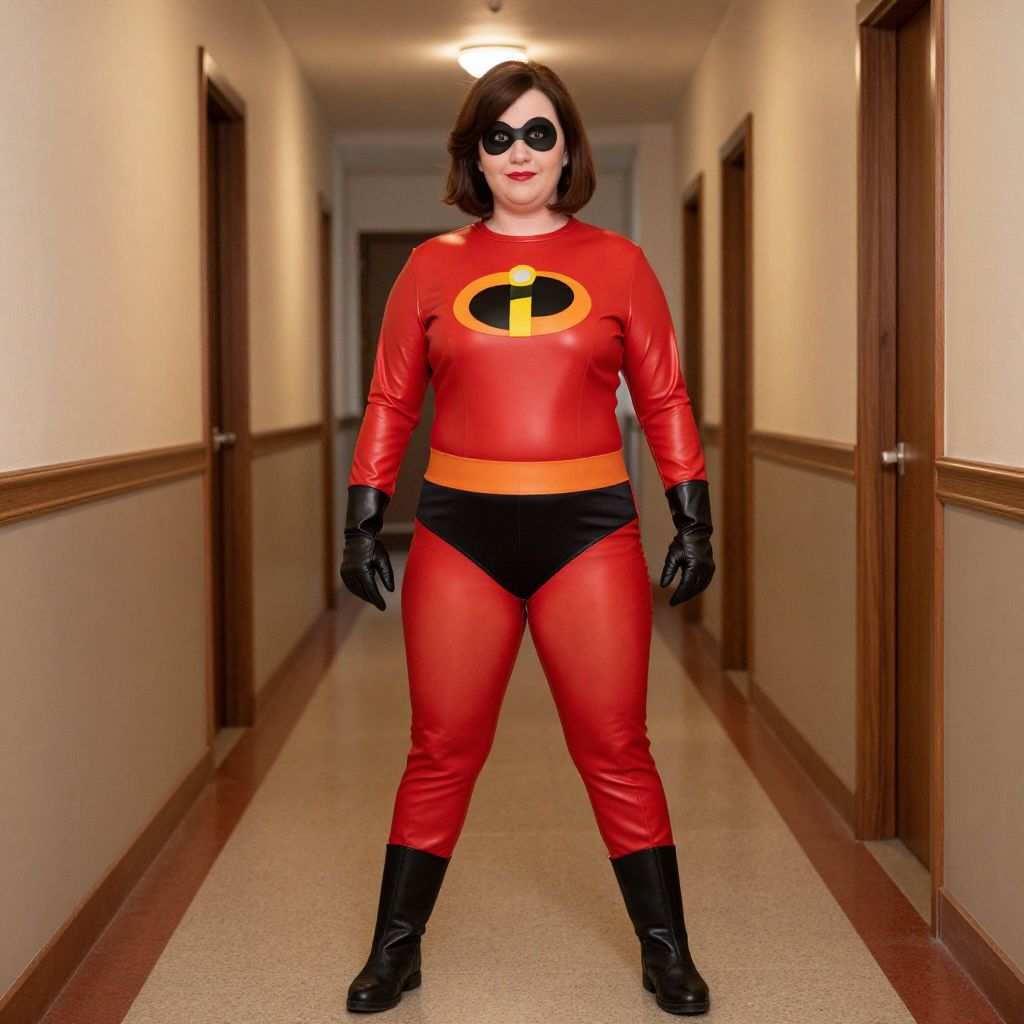 Plus Size Incredibles Costume, in a red leather outfit standing in a hallway