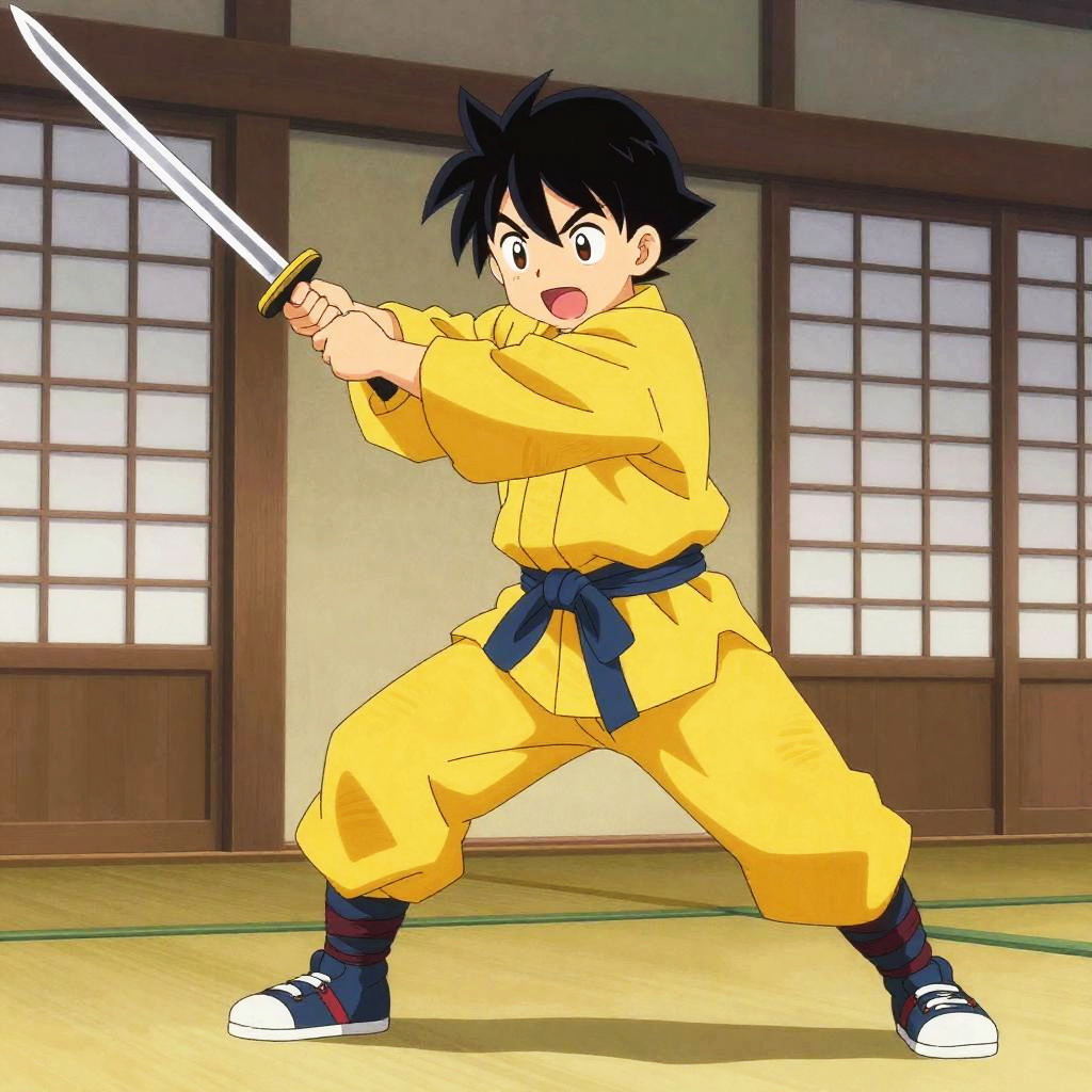 An energetic teenage samurai apprentice, wearing a bright training gi mixed with modern sneakers, engaged in practicing sword swings with playful enthusiasm, set in a traditional dojo with sliding paper doors, illustrated in the humorous yet action-packed anime style of Hideaki Sorachi.