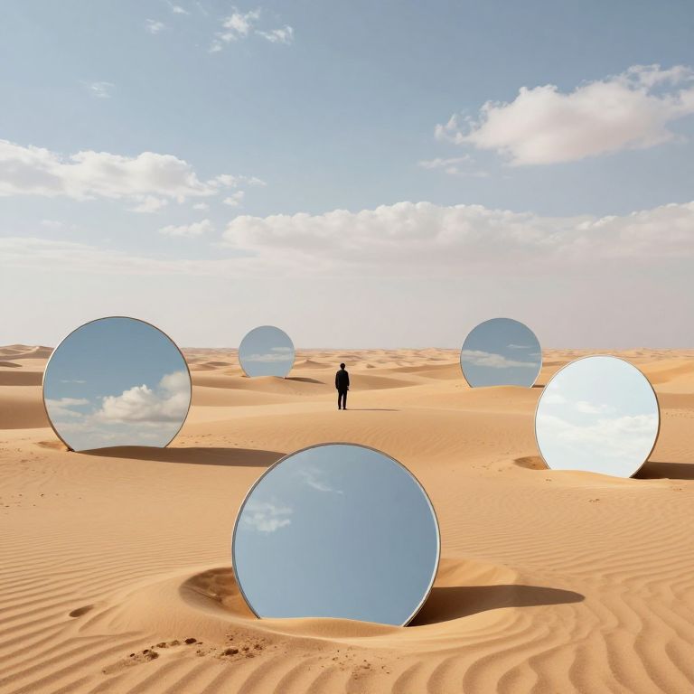 In a surreal 3D-rendered desert landscape, a solitary figure stands amidst a series of perfectly circular mirrors embedded in the sand, each reflecting ethereal skies and clouds that evoke worlds from different eras, blending high-definition realism with dreamlike fantasy.