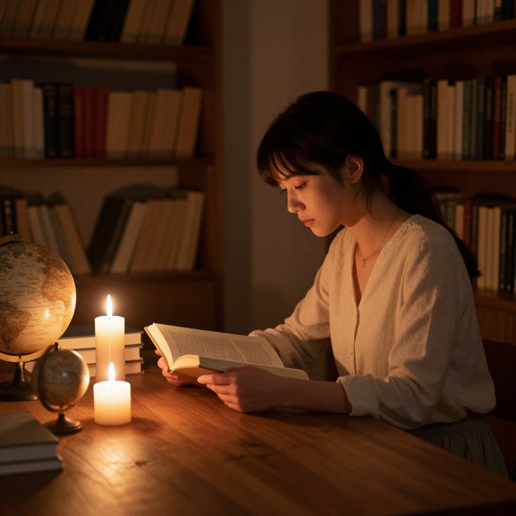 Candlelight illuminates a serene scene as a woman engrossed in reading sits at a wooden table, surrounded by shelves of books, with two lit candles casting warm glows and a small globe resting nearby.