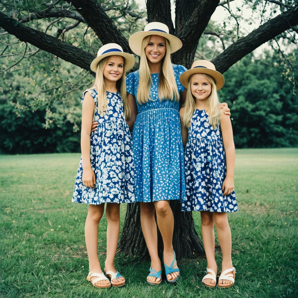 A blonde woman and her two blonde daughters standing outdoors in front of a tree, all wearing blue floral dresses and straw hats. They are smiling, with the mother wearing blue sandals and the girls wearing white sandals, posing on a grassy area with green trees in the background. The dresses feature floral prints and they have long straight hair.