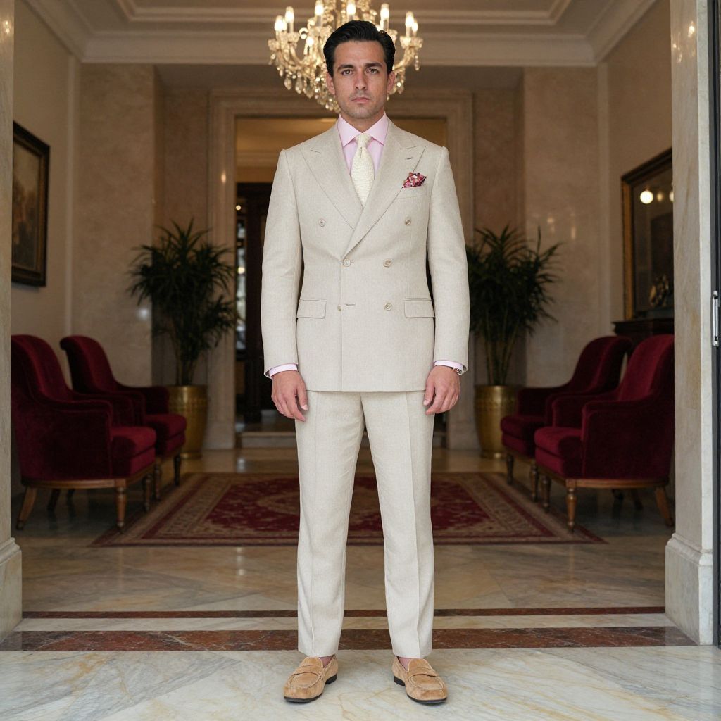 A man, light beige double-breasted suit, soft pink dress shirt, textured cream tie, tan suede loafers, floral pocket square, grand marble foyer, crystal chandeliers, plush red velvet seats, eastman film stock, confident expression, poised demeanor. Man has masculine face and piercing eyes