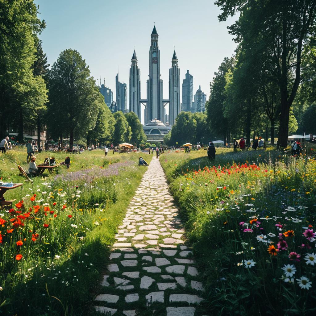 A stone pathway leads through a colorful meadow filled with wildflowers and picnicking families towards a futuristic city skyline featuring neo-futurist architecture with towering spires. Lush green trees surround the meadow on both sides, creating a striking contrast between natural and urban elements under a clear sunny sky.