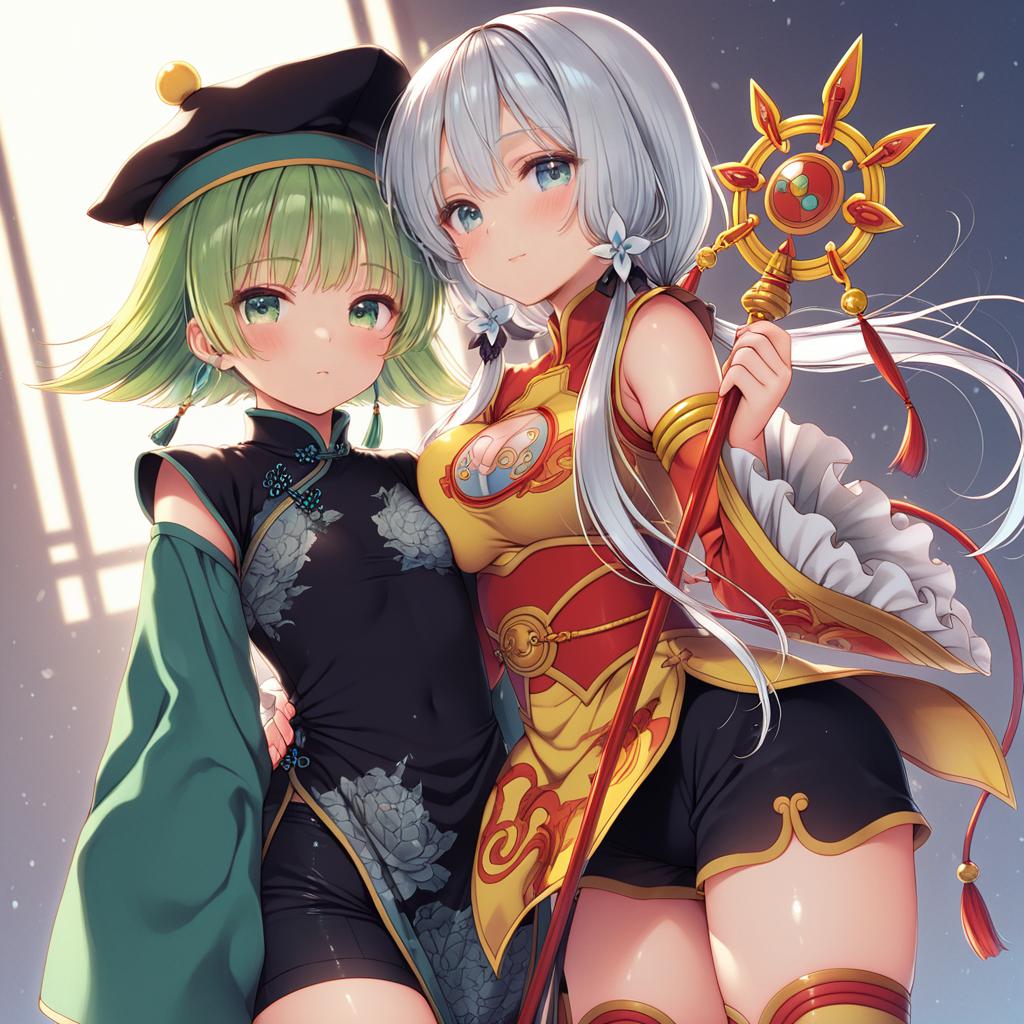 Digital artwork of two anime-style girls standing close together. The girl on the left has short green hair, green eyes, and wears a black and green traditional Chinese outfit with detached sleeves and a beret-style hat. The girl on the right has long silver hair, blue eyes, and is dressed in a red and yellow superhero costume with a decorative staff. Both outfits include modern and fantasy elements, with intricate patterns and accessories.