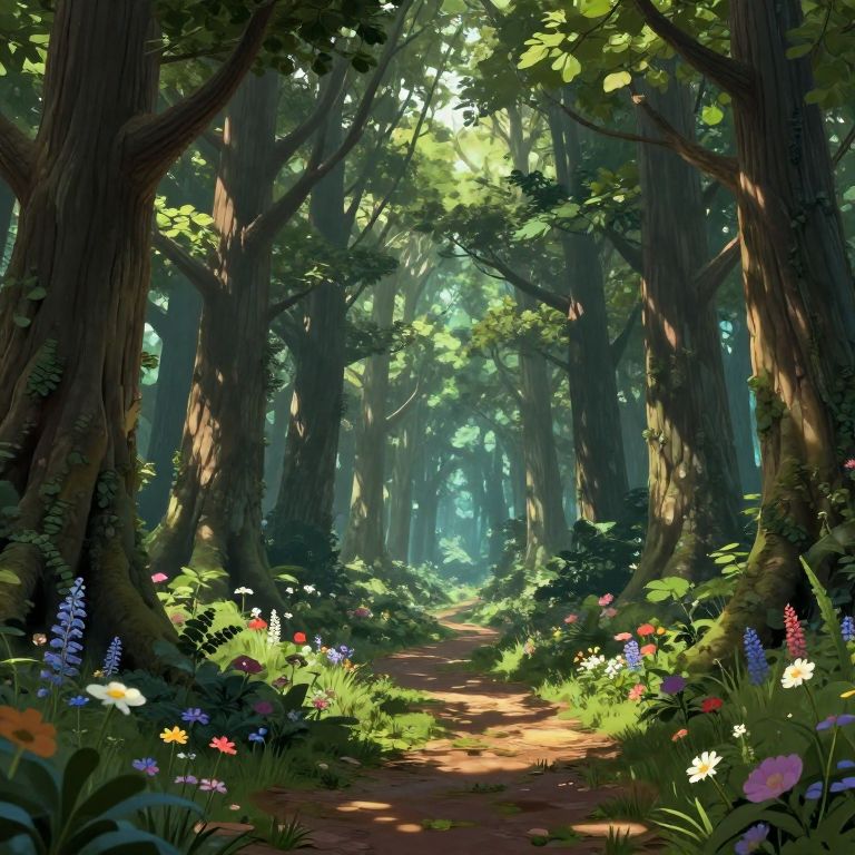 Digital illustration of a sunlit forest path lined with vibrant flowers, tall trees, and dappled sunlight filtering through dense greenery.