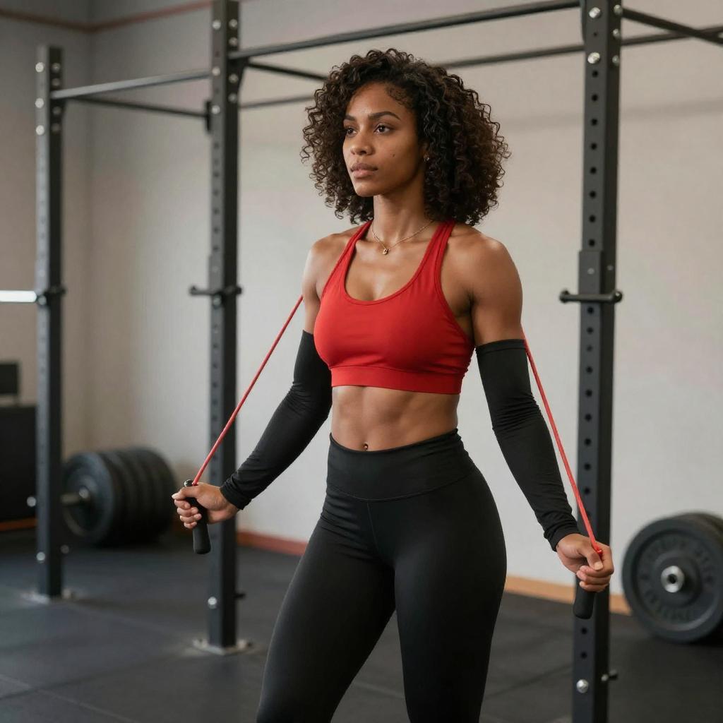 Photograph of a muscular, dark-skinned woman with curly black hair, wearing a white sports bra with a keyhole cutout and light gray high-waisted shorts. She is lifting a barbell in a dimly lit gym, surrounded by weight racks and exercise equipment. Her focused expression and defined abs are prominent.