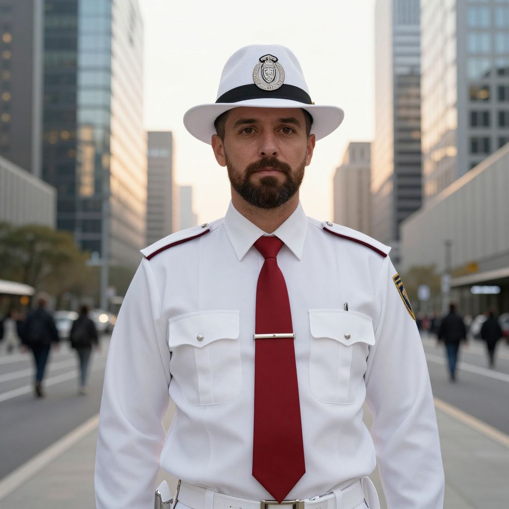 A distinguished man in a crisp white uniform with a red tie, wearing a white fedora-style hat adorned with a prominent emblem, stands confidently in a modern urban setting with soft sunlight filtering through the sky, casting gentle golden hues across the cityscape. He has a neat, well-groomed beard, warm brown eyes, and a composed, calm expression that conveys both authority and professionalism. His posture is straight, radiating dignity and leadership, as he faces the viewer with quiet confidence. The background features sleek skyscrapers, reflective streets, and subtle movement of pedestrians, all bathed in the soft, natural light of a clear afternoon—creating a sense of order, balance, and timeless presence.
